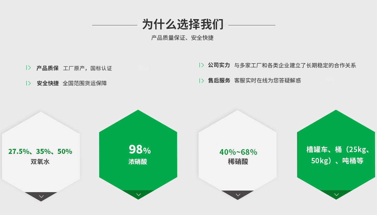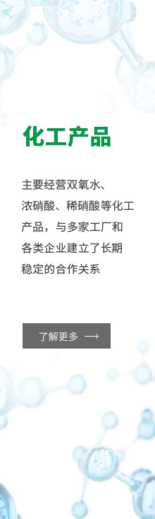 安徽安德諾化工產(chǎn)品銷售有限公司:位于合肥市蜀山區(qū),交通便利,主要經(jīng)營(yíng)雙氧水(27.5%、35%、50%)、濃硝酸(98%)、稀硝酸(40%~68%)等化工產(chǎn)品,與多家工廠和各類企業(yè)建立了長(zhǎng)期穩(wěn)定的合作關(guān)系。公司產(chǎn)品齊全,實(shí)力雄厚,重信用、守...